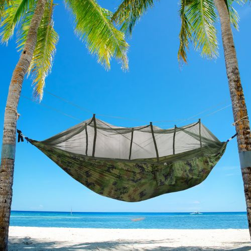 Seamless Outdoor Sleeping Hammock With Mosquito NetHammock Material: 210D nylon fabric (Parachute cloth)Mesh Material: High-Density NetSpecifications: 102in × 55.18inNet Weight: (1.43lb)Maximum Support Weight: 660lbs (300kg)Accessories:2m strap × 24m draw rope × 2Color Options: 14 colors availableApplicable Scenarios: Picnics, outings, camping, etc.Features:High-Quality Mesh Protection: High-density mesh prevents mosquitoes from entering, ensuring a comfortable and breathable outdoor experience.Easy Setup: Simple strap and rope installation allows for quick setup between trees.Lightweight & Portable: Weighing only 650g (1.4lb), it’s easy to carry for camping, hiking, and beach trips without adding bulk.Adjustable Strap System: Standard 2m strap allows for flexible tree distance adjustments, enhancing convenience.User-Friendly Installation: Mosquito net design enables hassle-free setup—just wrap the straps around trees, tighten, and enjoy.