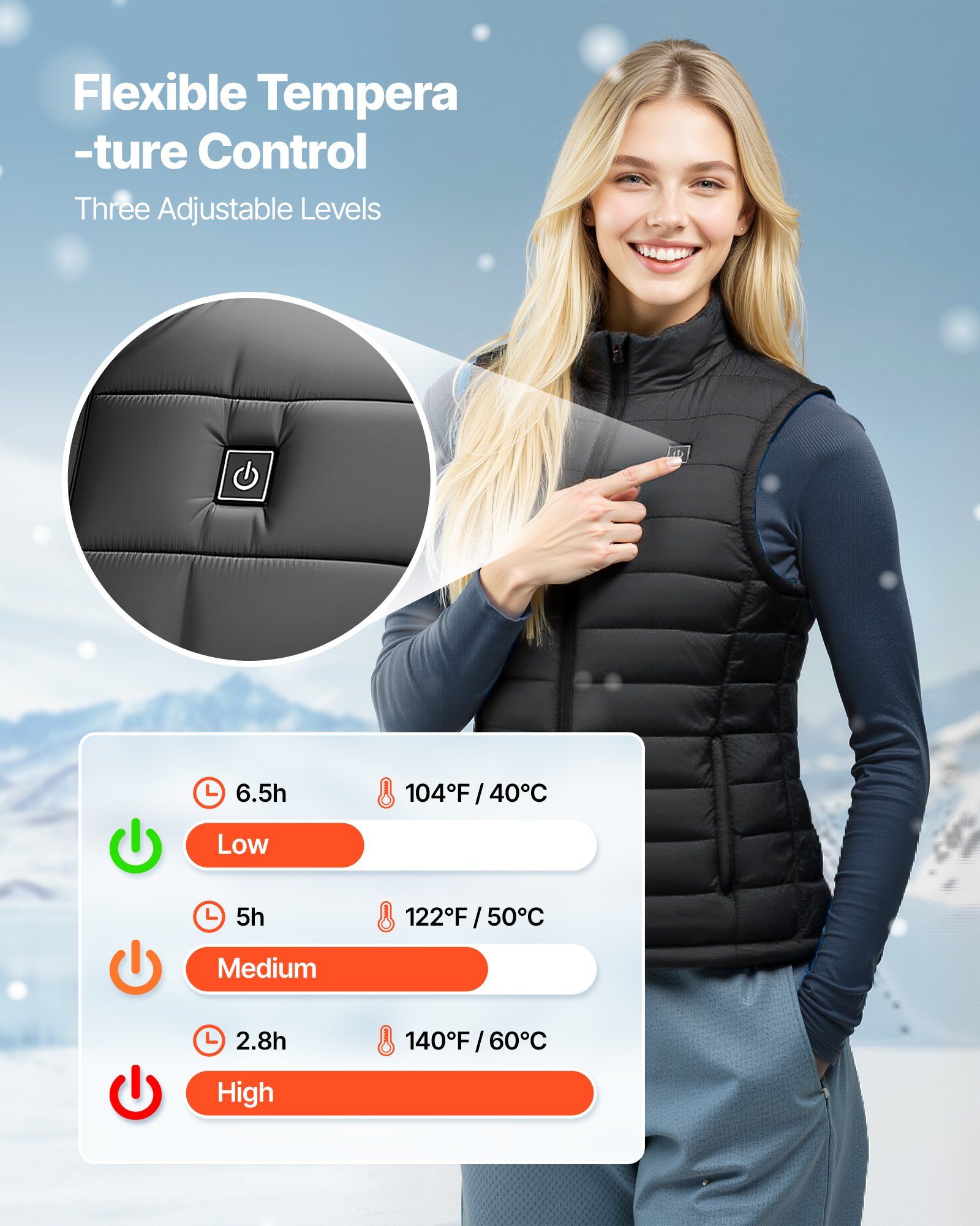 2.Three-Level Temperature Control: Our heated vest for women provides three heat settings-high 140 Fahrenheit /60 Celsius , medium 122 Fahrenheit /50 Celsius , and low 104 Fahrenheit /40 Celsius . You can flexibly adjust the temperature with a simple button according to your needs