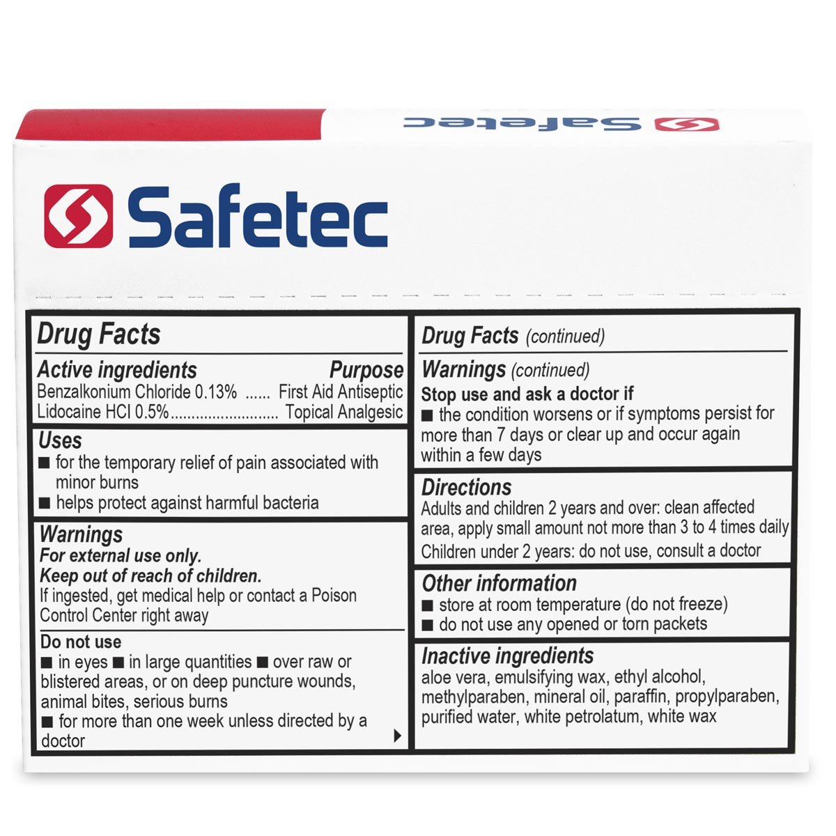 Safetec® First Aid & Burn Cream Helps relieve pain and protects cuts, scrapes and burns against contamination. First Aid & Burn Cream is non-greasy and non-irritating. Keep them in your purse, backpack, pocket or glove compartment. Great for on the spot use at home or at work. Packaged in convenient 25 ct. dispenser box. Contains: Benzalkonium Chloride and Lidocaine HCL.