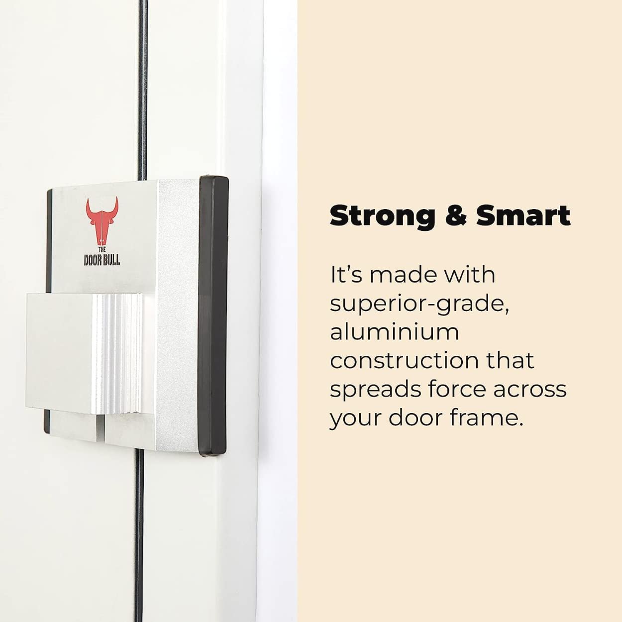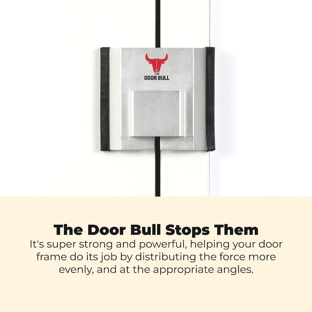• The Door Bull Stops Them! It's more robust and powerful. And it helps your door frame do its job, by distributing the force more evenly and at the appropriate angles. Do not settle for old-fashioned, ugly, oversized security bars for doors!