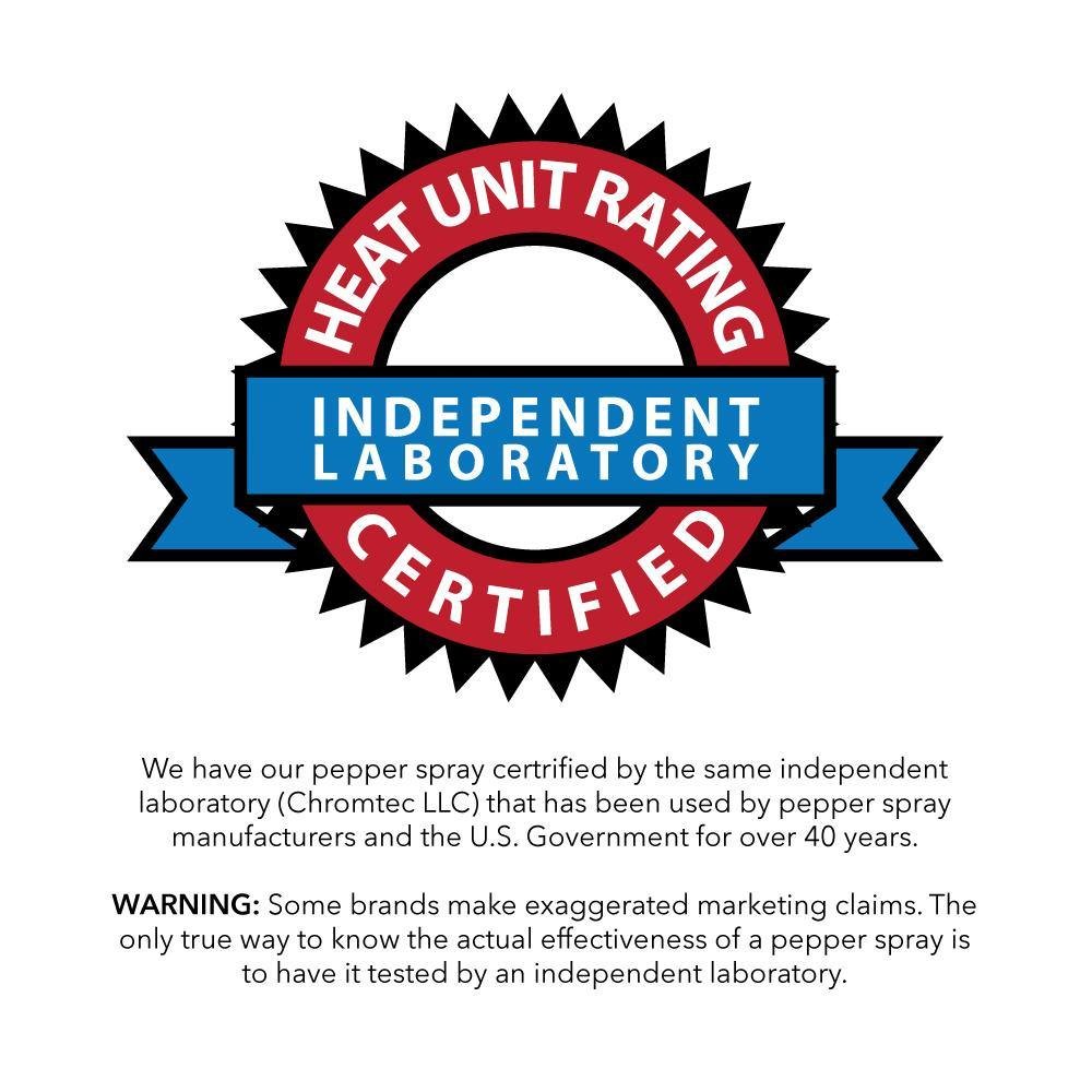 *We have our pepper spray certified by the same independent laboratory (Chromtec LLC) that has been used by pepper spray manufacturers and the US Government for over 40 years. This certificate is available upon request.
